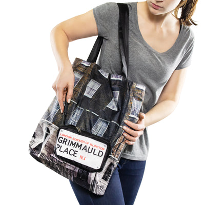 The Harry Potter shopping bag "Grimmauld Place" can do something similar: This spacious tote bag, modeled after the aforementioned house, can be stored space-savingly within itself! Yes, you heard that right: simply fold the bag, zip it up, and be amazed that only the street sign is visible!