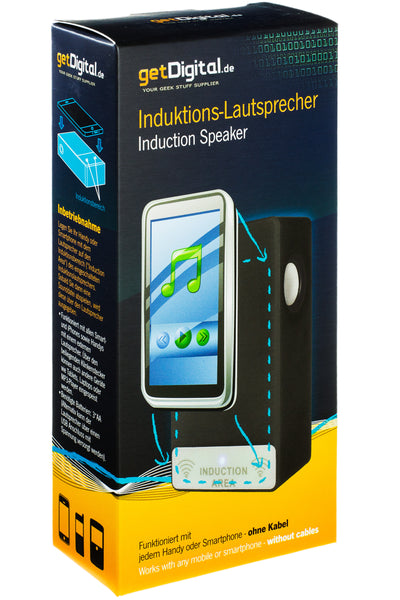 The magnetic field generated by the cell phone or smartphone speaker generates a current in the induction speaker that corresponds to the audio signal. This is amplified internally and output as sound via the external speakers, which can then be heard.