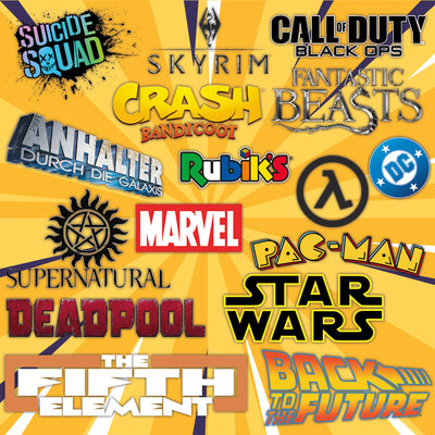 Darunter findest du Merchandise aus Marvel, DC-Comics, Pac Man, Star Wars, Deadpool, Halflife, Skyrim, Per Anhalter durch die Galaxis, Phatastische Tierwesen, Supernatural, Zurück in die Zukunft, Callof Duty, Crash Bandicoot und anderen Franchises!
