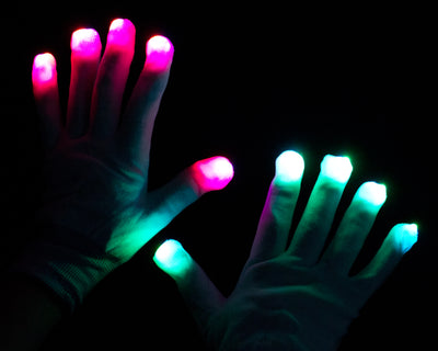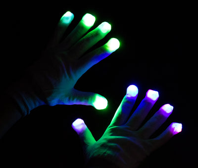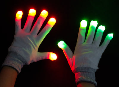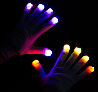 • Each fingertip of these gloves contains 3 colored LEDs.