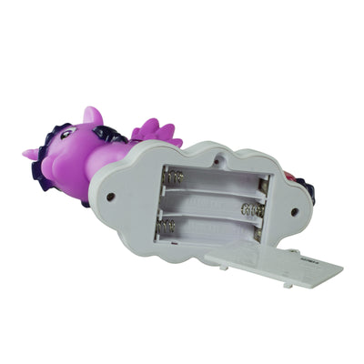 All your new magical pony friend needs are three AAA batteries, which are not included. You turn the lamp on and off with the button in front of Twilight Sparkle's hooves, and it emits soothing purple light. Naturally, the Alicorn has all the important features you know from the series: horn, wings, two-colored mane and tail, and stars on the flank.