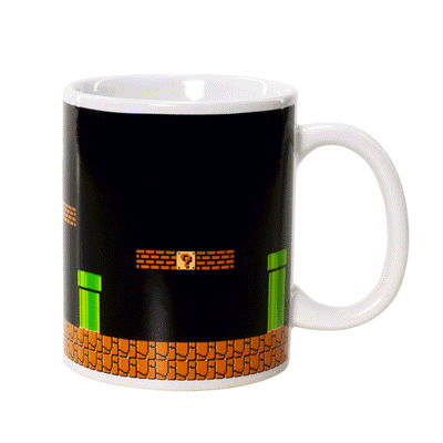 • Ceramic mug that shows a level from the game Super Mario Bros.; -; Changes appearance when a hot drink is poured in; -; Officially licensed product