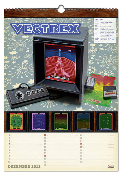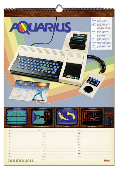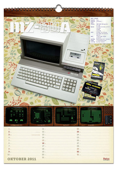 The calendar for the year 2011 features 12 different computers and consoles from the 70s, 80s, and 90s. Each month includes a large image of the retro computer, along with technical information, game screenshots, and additional extras.