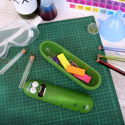 With the "Pickle Rick" storage box from Rick and Morty, you can now turn your pencil case into a pickle! More specifically: into a resin version of Pickle Rick! Under the lid of this detailed and hand-painted replica of the most dangerous pickle in the galaxy, you can store pens, paper clips, and other small items, so your desk can finally be tidy. You can safely ignore Rick's mumbling. What harm can a pickle do to you?