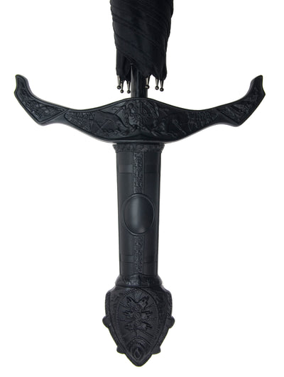 The Knight's Sword Umbrella is a black cane umbrella with an extra-long handle that looks like that of a knight's sword. The Knight's Sword Umbrella is very high quality and made of sturdy plastic, metal, and fabric. Directly above the handle is a button that allows you to automatically open the umbrella.