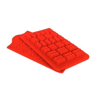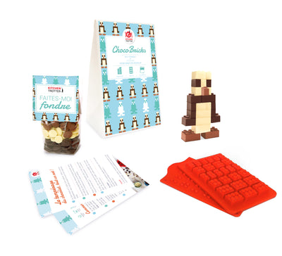 In addition to a silicone mold with which you can make studded building blocks, the kit also contains multilingual instructions and fine melting chocolate cookies in white, brown and black. Now all you have to do is melt the chocolate in a bain-marie, pour it into the mold and wait.