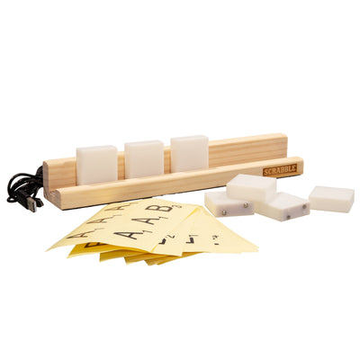 Contents: Lamp base, instructions, USB cable, 7 token lights, 60 stickers ((5x A, 3x B, 1x C, 3x D, 6x E, 1x F, 2x G, 2x H, 5x I, 1x J, 1x K, 2x L, 2x M, 3x N, 4x O, 2x P, 1x Q, 3x R, 2x S, 3x T, 2x U, 1x V, 1x W, 1x X, 2x Y, 1x Z)