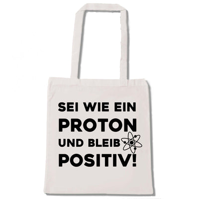 • Naturfarbener Stoffbeutel mit dem Aufdruck: „Sei wie ein Proton und bleib positiv!“