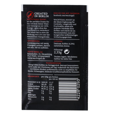 Wachtigall gives you the necessary energy boost when you start to feel tired after hours of housework, boring lectures, late-night gaming, or waiting for measurements. The big advantage is that it doesn't have the typical sticky taste of energy drinks but tastes neutral. So, you can stir the powder into water or any other drink. This helps boost your concentration and effectively combats any fatigue, thanks to good old caffeine. :)