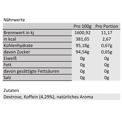 One sachet contains 2.33 g with 4.29% caffeine content and is enough for about 330 ml of liquid. You can find the exact ingredients on the photo. However, you can also start with a little less, as caffeine affects everyone differently. Excessive consumption always carries the risk of turning into a second hyperactive Fry. You should definitely not drink more than three servings a day; sometimes, you just need good old-fashioned sleep. ;)