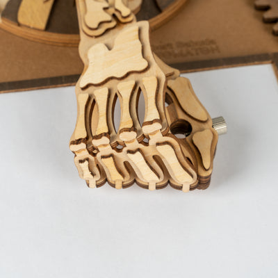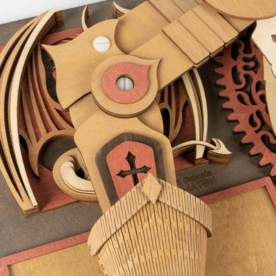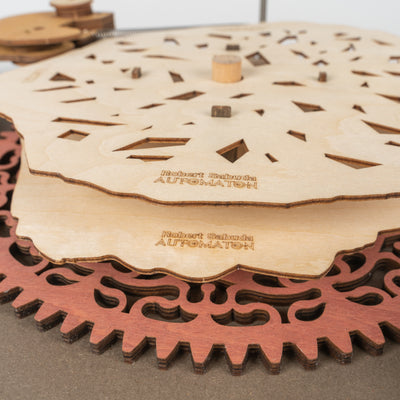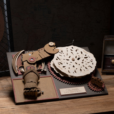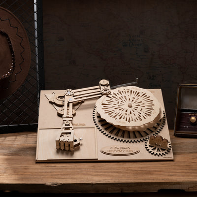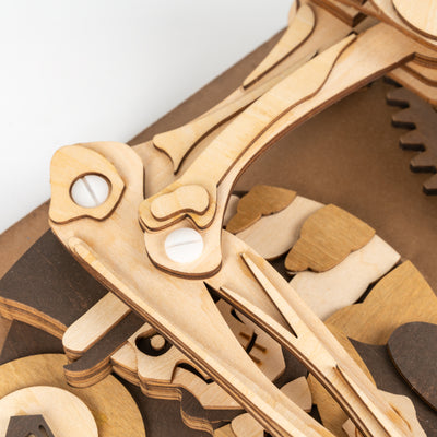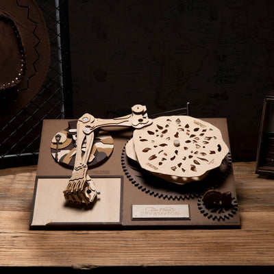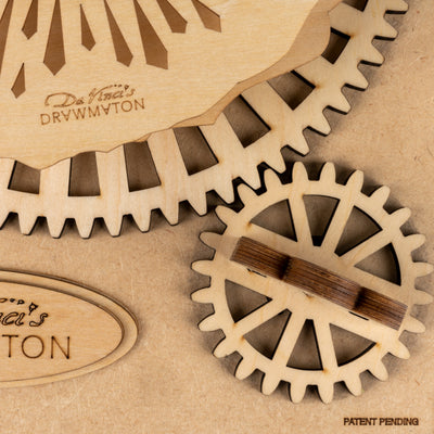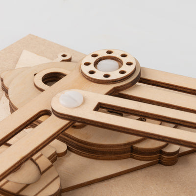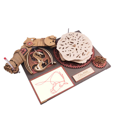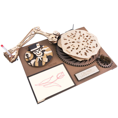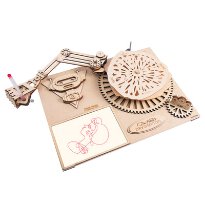 drawing machine wooden kit in the style of Da Vinci! After assembly, you hold an impressive construct in your hands that takes over the drawing for you! As soon as you turn the key on the right side, the mechanical arm begins to draw fascinating pictures with the pen you previously placed in its fingers! To ensure you (and the arm) don't get bored, four different motif discs are included, allowing you to quickly swap the pictures the arm draws.