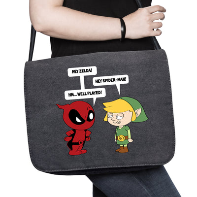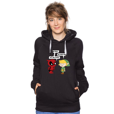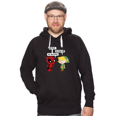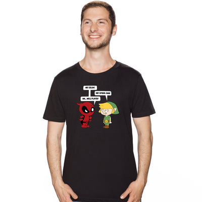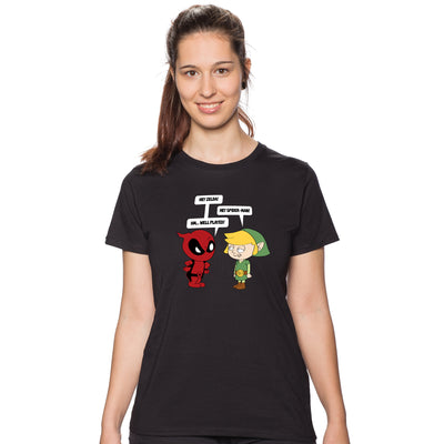 Sometimes, however, particularly common mix-ups become running gags. The "Zelda meets Spiderman" shirt shows two of the best-known ones: Deadpool teases Link that he is often mistaken for Zelda, and Link counters that Deadpool's costume at first glance resembles that of his buddy Spiderman. Name tags would certainly help here...