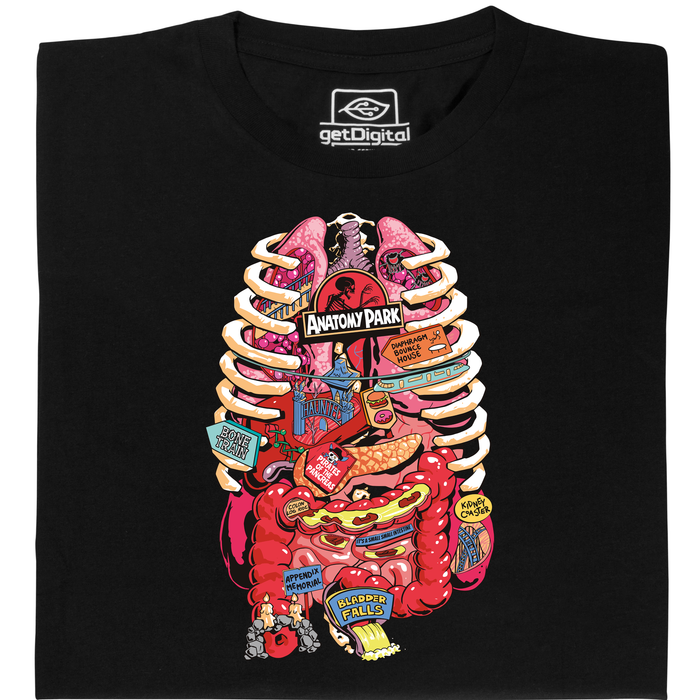 Immerse yourself in the crazy world of "Rick & Morty" with this unique T-shirt depicting the legendary Anatomy Park! This design brings the chaotic and adventurous atmosphere of the popular TV series straight into your wardrobe. In the style of an amusement park, but set in a human body, the motif shows various attractions such as the "Bone Train", "Bladder Falls" and the "Hepatitis A River Adventure".