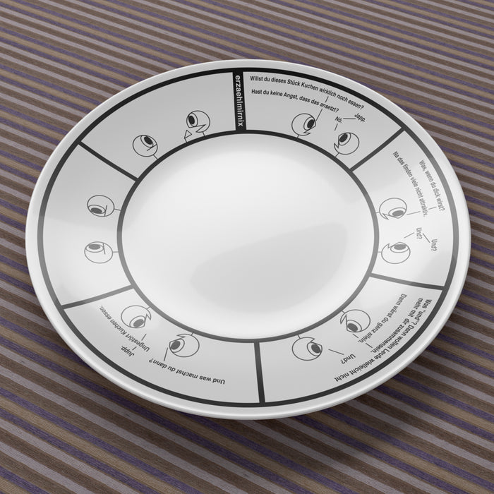 If you like to eat a lot, you're bound to get a stupid remark. But in future you won't have to come up with any quick-witted answers because you can simply let your plate speak for you. This Erzaehlmirnix cake plate features an Erzaehlmirnix comic strip that shows why it's completely pointless to interrupt people with stupid comments while they're eating. Because nothing, not even being thin, is better than eating cake undisturbed! ;)