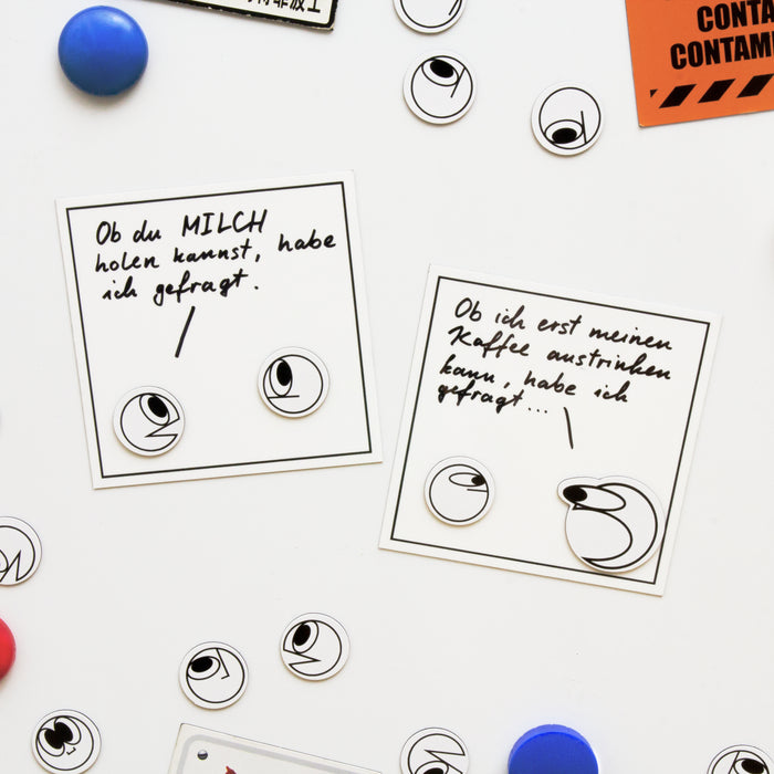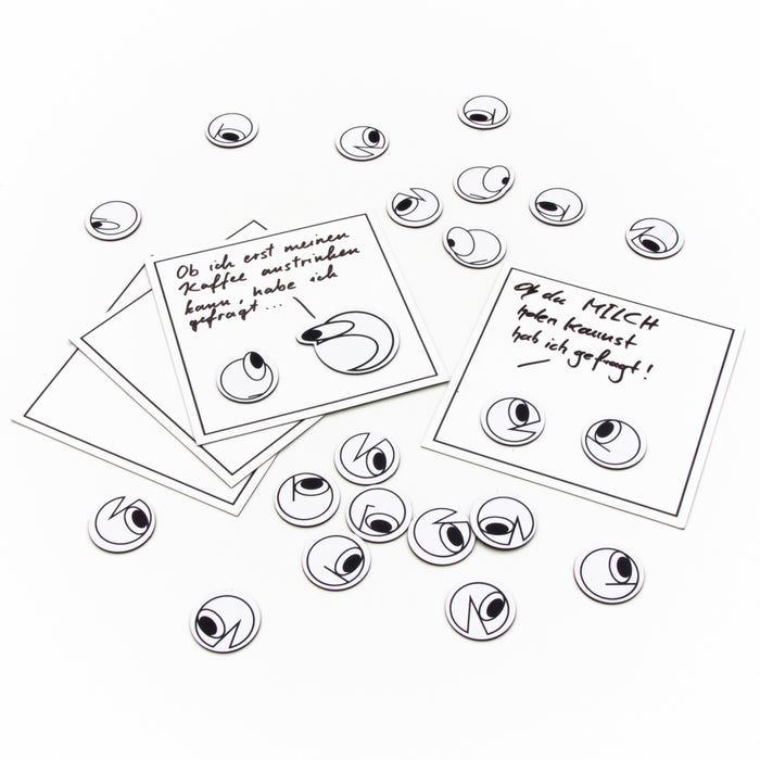 This fridge magnet set contains 23 small characters with different facial expressions, as well as 4 rewritable magnetic boards. You can combine the boards into a four-part comic and write your own dialog on them with a non-waterproof marker (not included). Whether you're venting your feelings, reminding your roommate to fetch milk or telling a joke: Your own unique Erzaehlmirnix comics are within reach with these fridge magnets!
