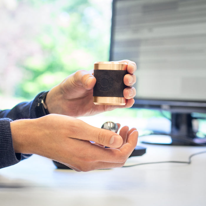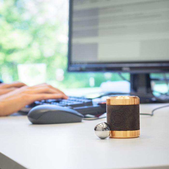 Feel Flux is not only further proof that physics is exciting - due to its high-quality materials, the neodymium sphere, the copper cylinder and the fine leather strap that surrounds it, it also looks and feels great.