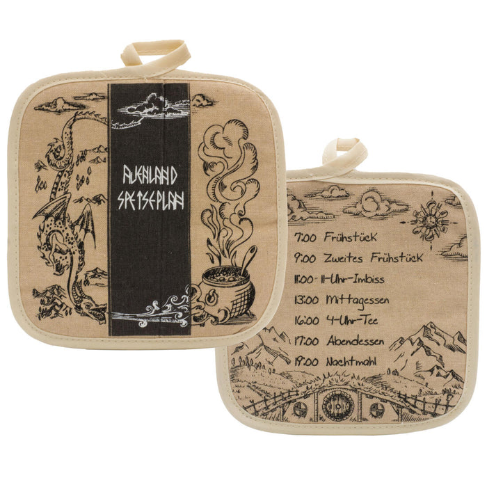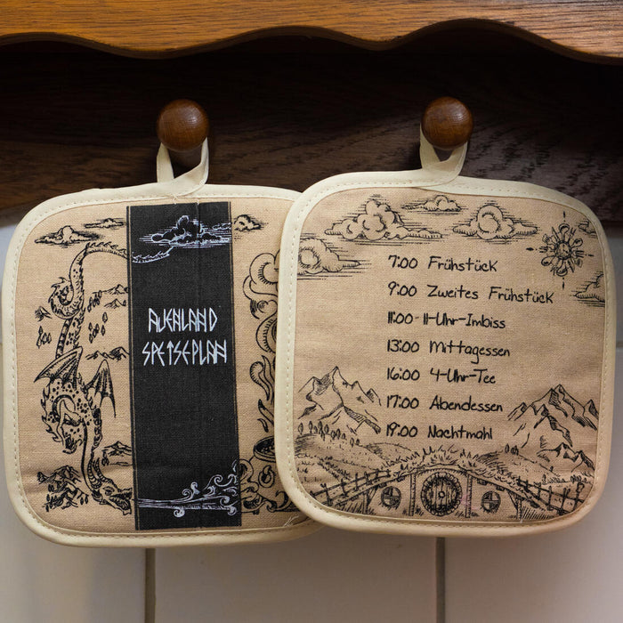 Wer so viel essen muss, wie die Halblinge, muss auch viel kochen – und sollte sich dabei die Finger nicht verbrennen. Um das zu verhindern, kannst du ab sofort das Topflappen-Set Auenland Speiseplan benutzen. Sie bewahren sowohl deine Hände, als auch deinen Tisch vor heißen Töpfen oder Pfannen, denn sie sind bis zu 300°C hitzebeständig.