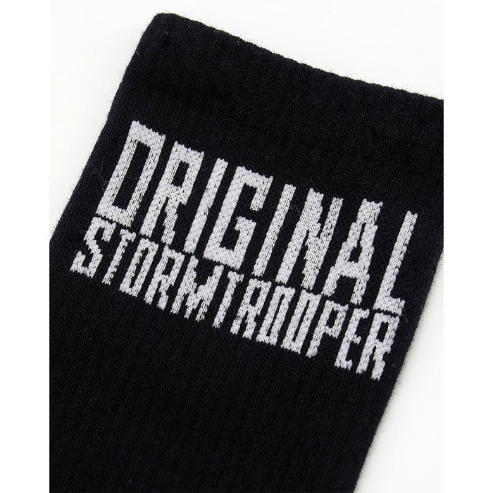 Für ihre täglichen Sporteinheiten tragen sie ausschließlich die vom Imperium gestellten Stormtrooper Sportsocken „Sport Trooper“. Wir konnten einige davon ergattern, sodass du hier gleich ein Set aus einem Paar schwarzer und einem Paar weißer Socken bekommst. Darauf zu sehen sind die ikonischen Helme der Sturmtruppler und auf den schwarzen Socken der Schriftzug „Original Stormtrooper“. Keine Sorge, das bedeutet nicht, dass die Socken schon getragen wurden. ;)