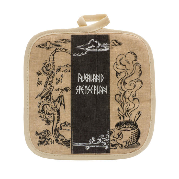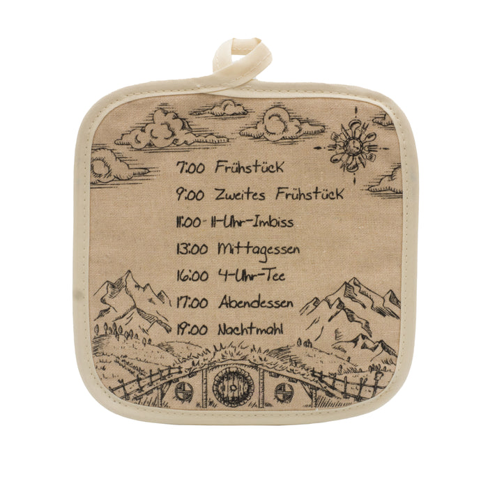 The halflings are often ridiculed - for their size, their hairy feet or their eating habits. But let's be honest, we actually envy them their seven meals a day. So much delicious food seems to make them very happy, if you look at most of the inhabitants of the Shire. And there's nothing wrong with imitating their eating habits from time to time. The two potholders show you the exact Shire menu so that you don't miss a meal (it would be scandalous to skip the second breakfast!) and protect both your hands and your table from hot pots and pans.